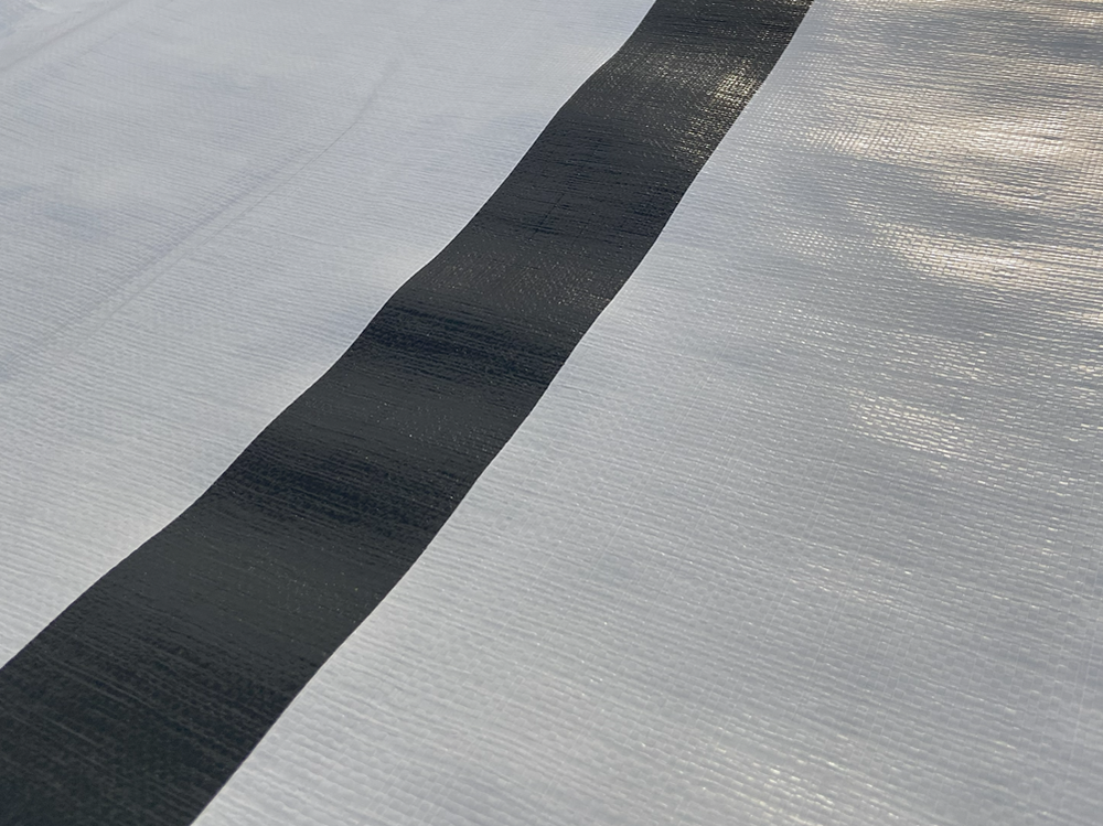 Woven HDPE black fibers fabric laminated on both sides with LDPE coating. Reinforced bands with pre-punched 8mm holes on the 2 side bands at 0.1m +/-10% intervals, positioned in the centre of the bands |